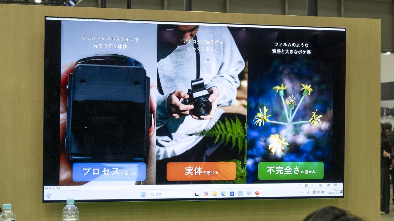 촬영 과정에서의 일련의 동작이 중시된다. 웨이스트 레벨에서 광학상을 포착하고, 가동 미러를 통해 수동으로 초점을 맞추는 방식을 채택했다. 효율적인 촬영이 주류인 현대에, 일부러 수고를 들이는 조작감은 촬영이라는 행위에 독특한 멋을 더한다. 고기능화와는 다른 이 접근 방식은 세대를 불문하고 사진의 근원적인 즐거움을 재인식시킬 가능성을 내포한다.